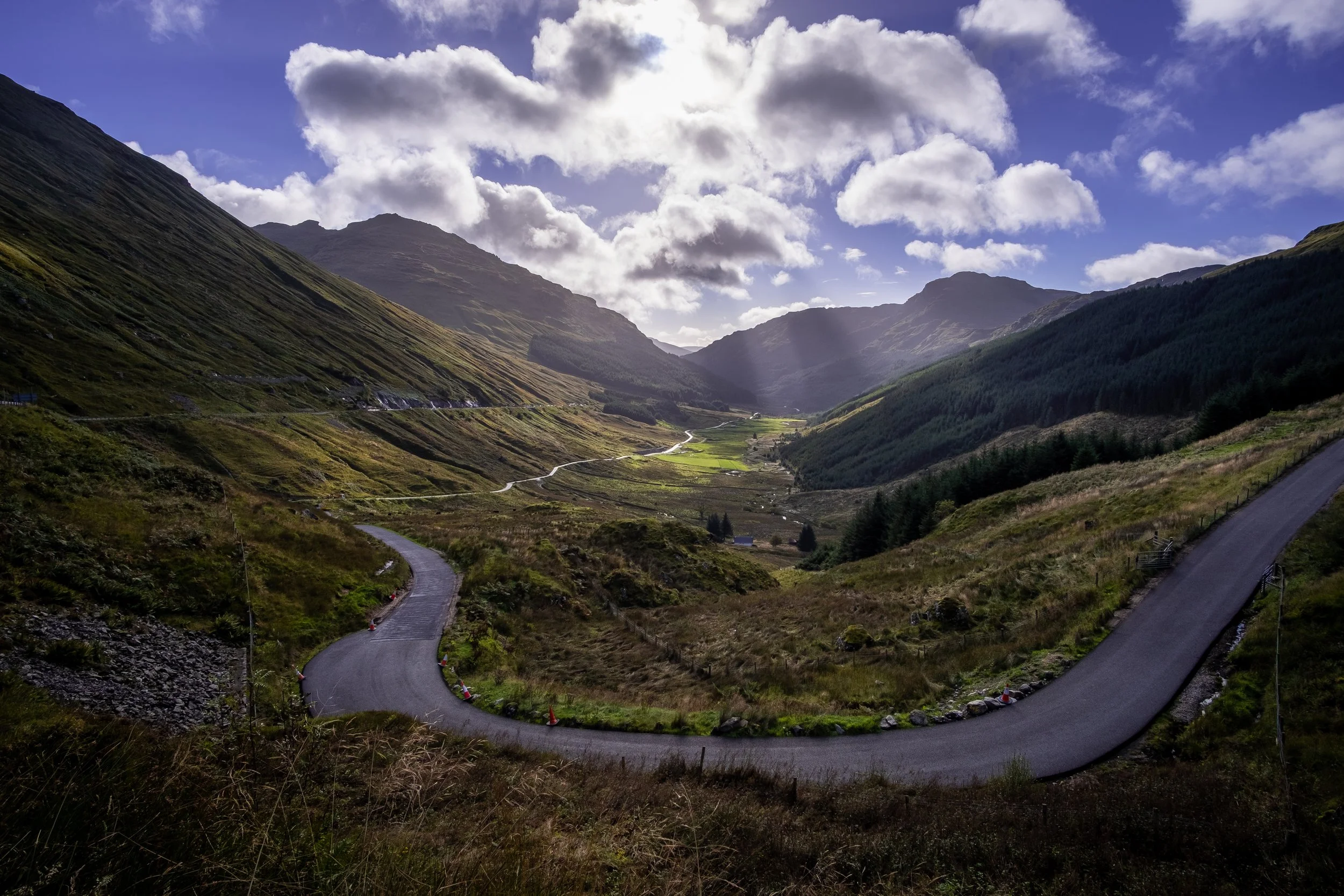 The view at the Rest And Be Thankful Viewpoint. That twisty road is not the road you come in on. That's just an access road for the farms in the valley below. The main road is that straight line you see in the mid left of the image on the mountain side.